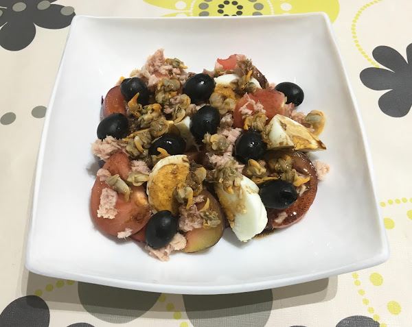 - Añade una lata de atún a cada plato y reparte los berberechos.