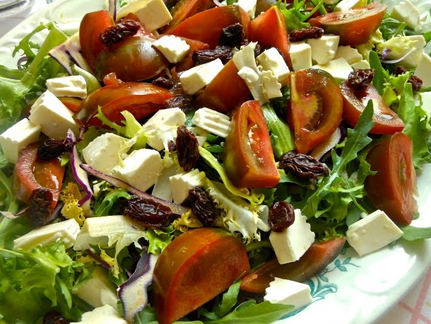A continuación mezcla en una ensaladera las hojas de ensalada variadas, las pasas, los quesos troceados y los tomates cortados en gajos.