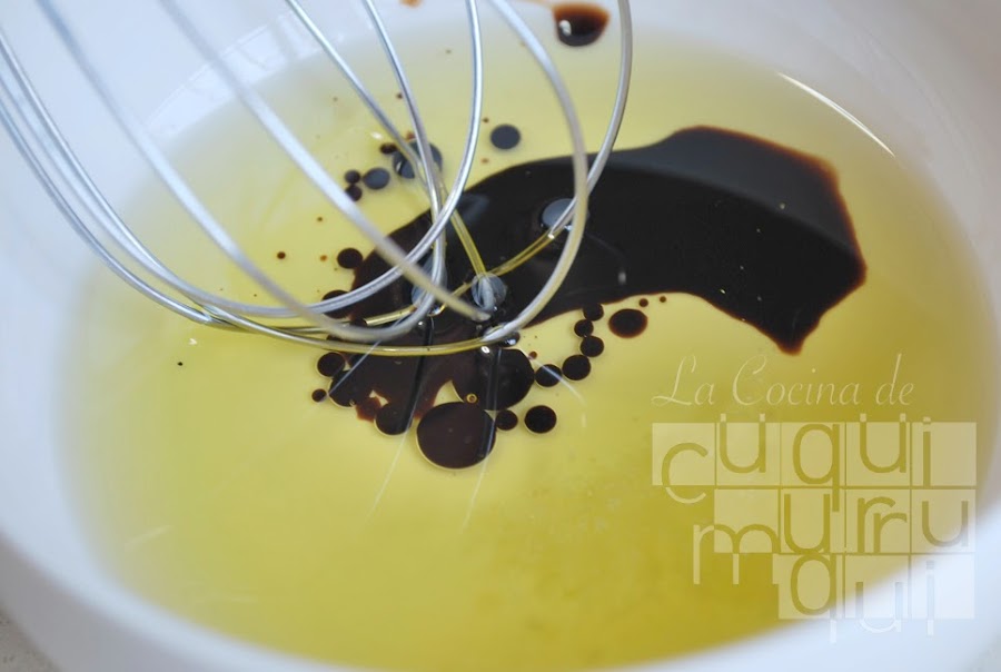 Para la vinagreta echamos tres partes de aceite por una de vinagre. Si no tenéis de módena podéis usar de manzana por ejemplo. Saláis un poco y bañamos la ensalada.