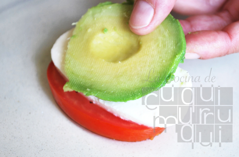Con todo preparado comenzamos a montar los platos. Primero ponemos una rodaja de tomate, encima una de mozarella y al final otra de aguacate. Ponemos dos capas de cada ingrediente.