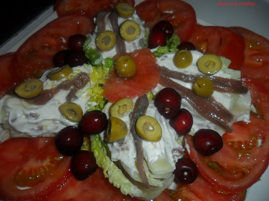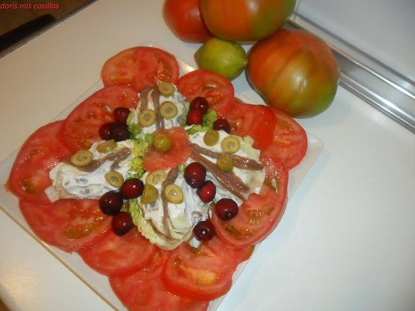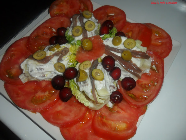 Acomodamos las anchoas bien escurridas, aceitunas rellenas a rodajitas, y si encontramos cerezas o rodajas de fruta de temporada bien limpias y escurridas.