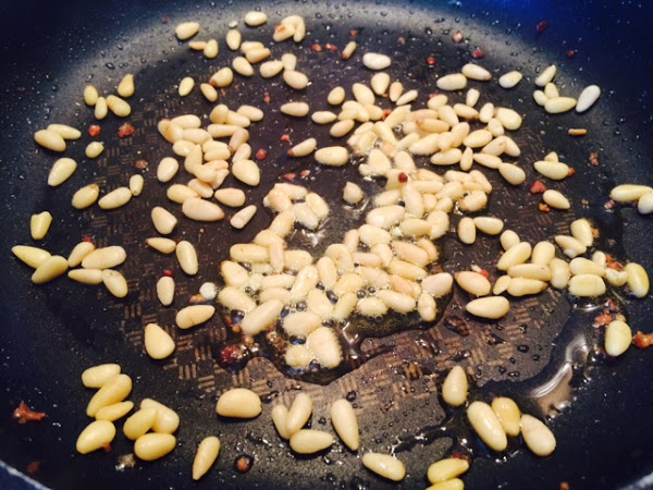 Sobre la poca grasa que queda en la sartén de freir el jamón, echar el puñado de piñones y sin parar de moverlos (porque se tuestan rápidamente) sacarlos en cuanto empiecen a dorarse y reservar.