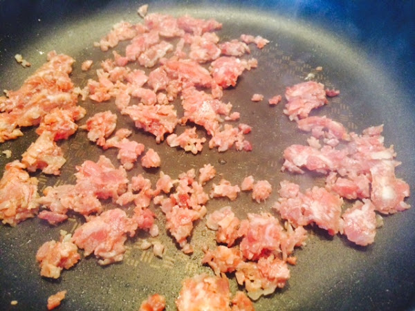 Comenzaremos picando finito el jamón ibérico y friéndolo en la sartén sin nada de aceite. Cuando empiece a dorarse un poco, sacarlo a un plato con papel de cocina y reservar.