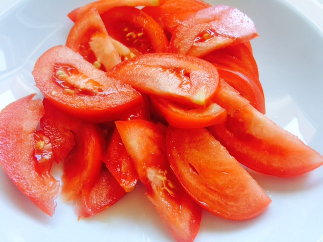 Para eso, echo una pizca de sal en la base del plato y coloco los gajos de tomate (bien lavado) encima. Espolvoreamos un poco de orégano y otra pizca de sal.