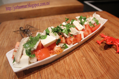 Cortamos el queso en trozos similares al tamaño de los trozos del tomate.
