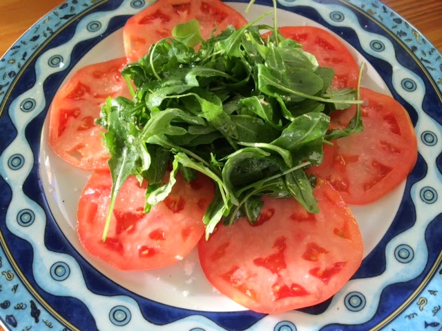 En la base del plato, poner una capa de rodajas finas de tomate y echar un poco de sal maldon.