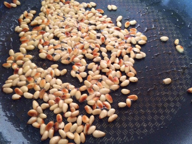 En una sartén, con una gota de aceite poner los piñones y remover. ¡ojo! porque enseguida se queman.