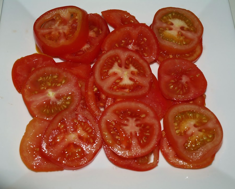 - Lavamos y cortamos los tomates en rodajas. Los ponemos en una fuente.