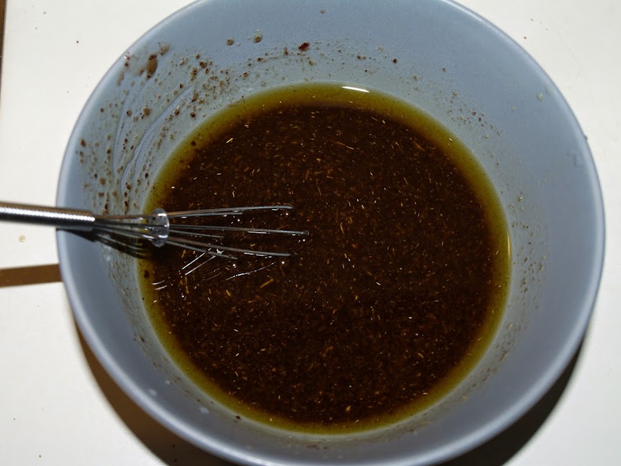 - Mezclamos el sumac, comino, aceite, sirope y vinagre (y sal), y mezclamos bien.