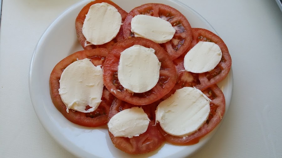 Cortamos la mozzarella a rodajas parecidas a la de los tomates.