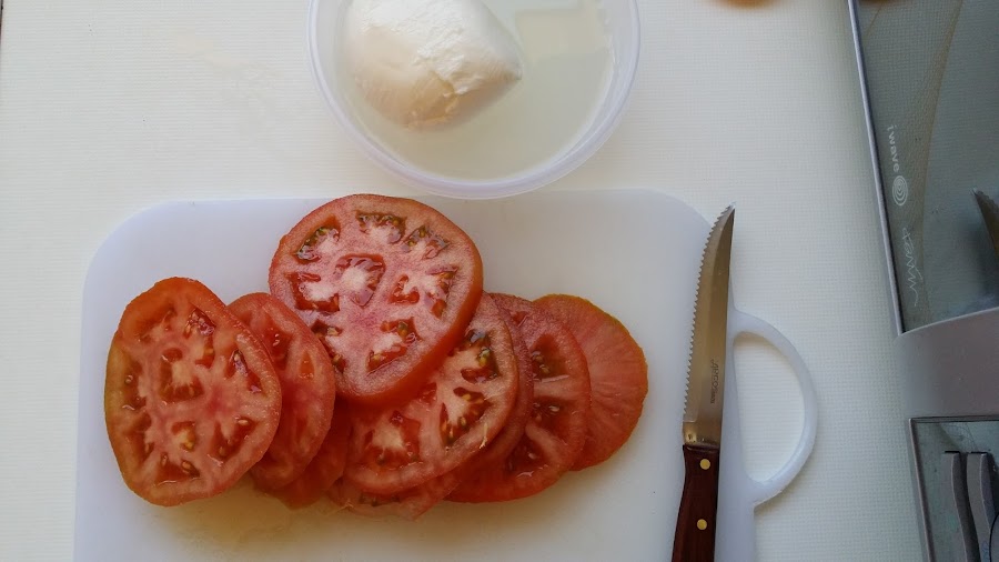 Lo primero que haremos será limpiar bien los tomates y cortarlos a rodajas. Como sabréis, es mejor usar un cuchillo de sierra que uno liso para esa labor. Sacaremos la mozzarella de su envase. Si no la vais a consumir toda de una sentada como en mi caso, vaciad todo el contenido en un recipiente para reutilizar el suero y conservar así la mozzarella sobrante.