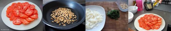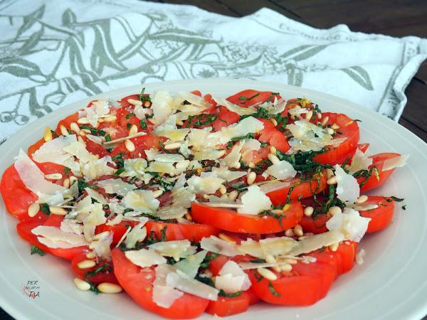 Protagonista destacado es el tomate, aprovechando que está en el mejor momento de la temporada, hay que elegir variedades carnosas, con mucha pulpa y poca semilla, en su punto de maduración y a ser posible con sabor. Por ejemplo un Cor de bou (Corazón de buey), un Rosa de Barbastro o un Raf. Y para el aderezo unos secundarios dignos de la ocasión, piñones, albahaca, limón, parmesano y un buen aceite de oliva extra virgen.