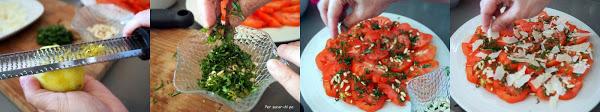 Rallar un poco de piel de limón y hacer una mezcla con los piñones y la albahaca. Repartirla por encima de los tomates y añadir el queso parmesano y unas gotas más de aceite de oliva.