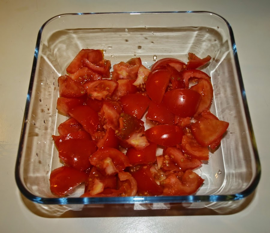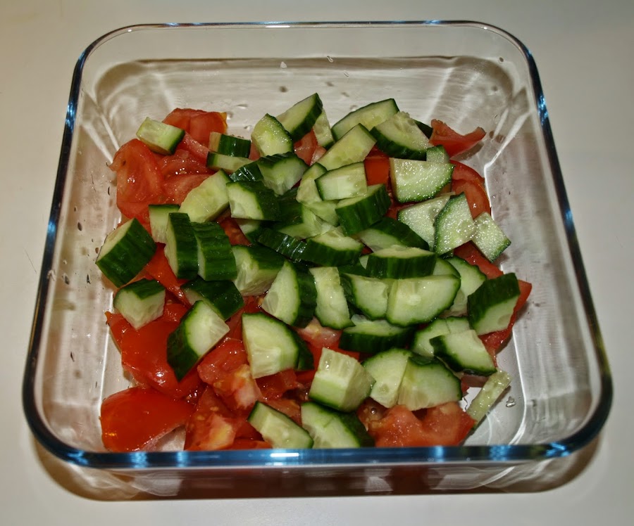 - A continuación añadimos el pepino en trozos en más o menos igual proporción que el tomate.