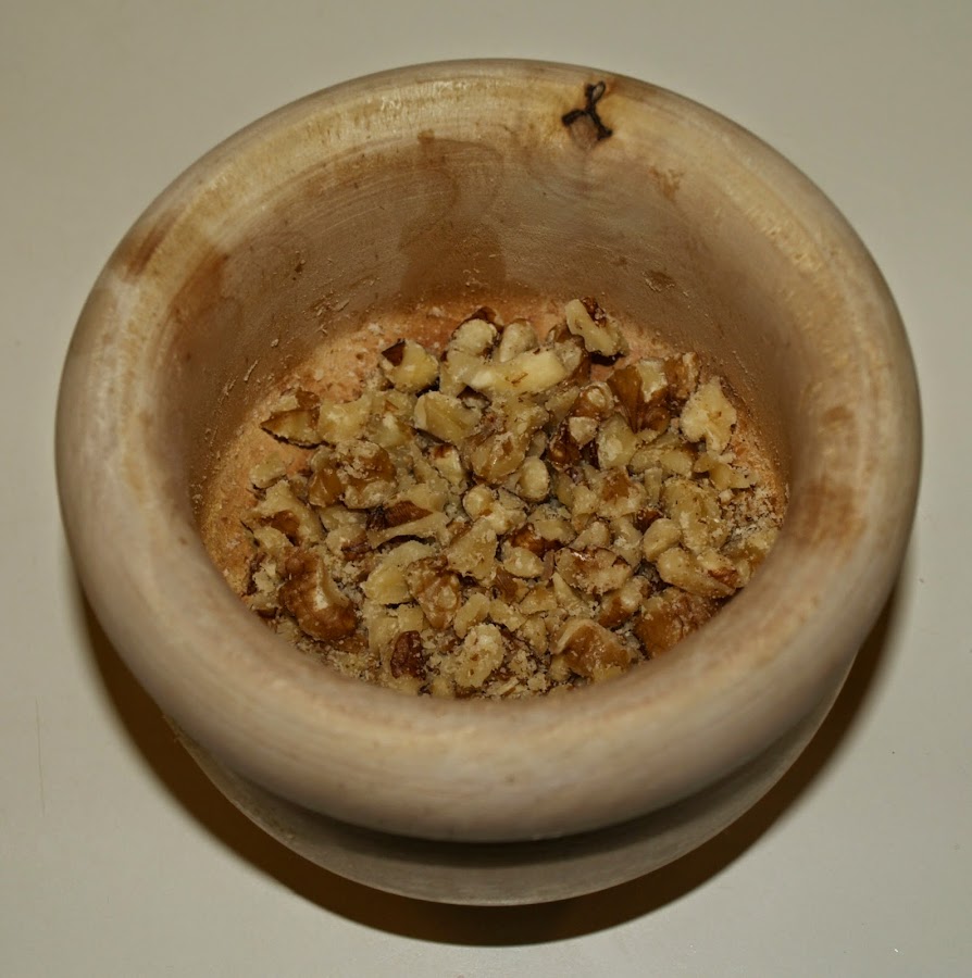 - Machacamos un puñado de nueces en un mortero y añadimos.