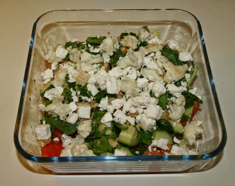 - Terminamos con un poco de queso Gorgonzola u otro queso azul que nos guste y aliñamos con sal, aceite y vinagre. Removemos, y a comer!!!