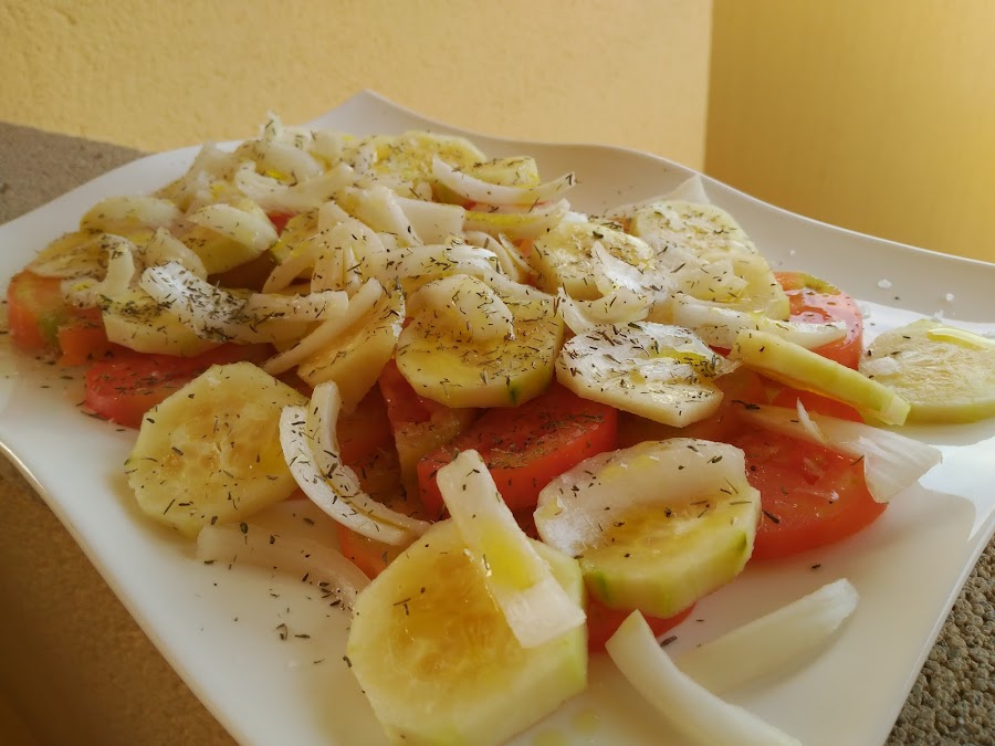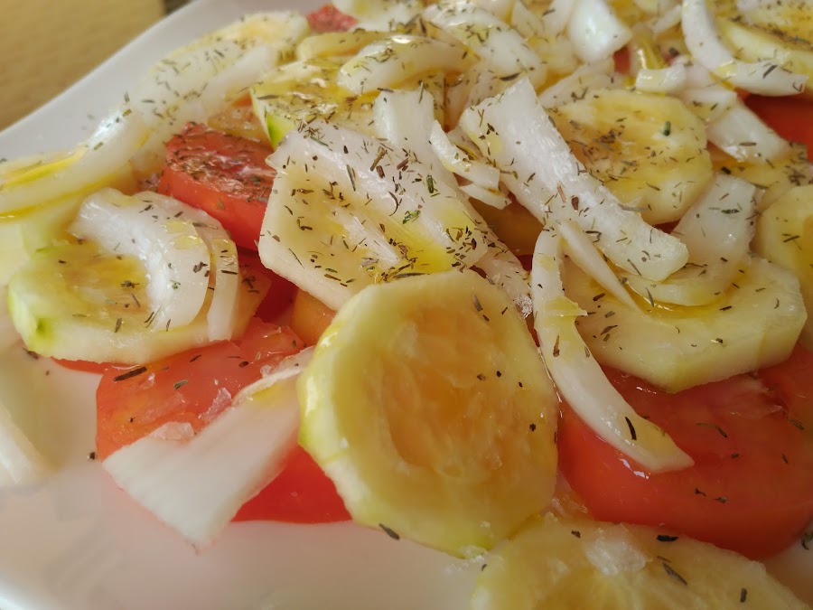 - Troceamos los pepinos y los tomates, los repartimos en una bandeja o ensaladera, repartimos la cebolleta escurrida, y salpimentamos, regamos con aceite, espolvoreamos albahaca y lista!!