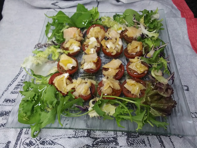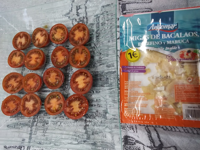 Cortamos los tomates cherry por la mitad y los disponemos en un plato con el corte hacia arriba.