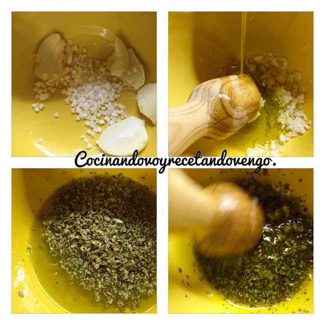 En un mortero, ponemos los dos dientes de ajos, la sal y el aceite de oliva, majamos o machacamos para que se mezclen bien los sabores en el aceite.
