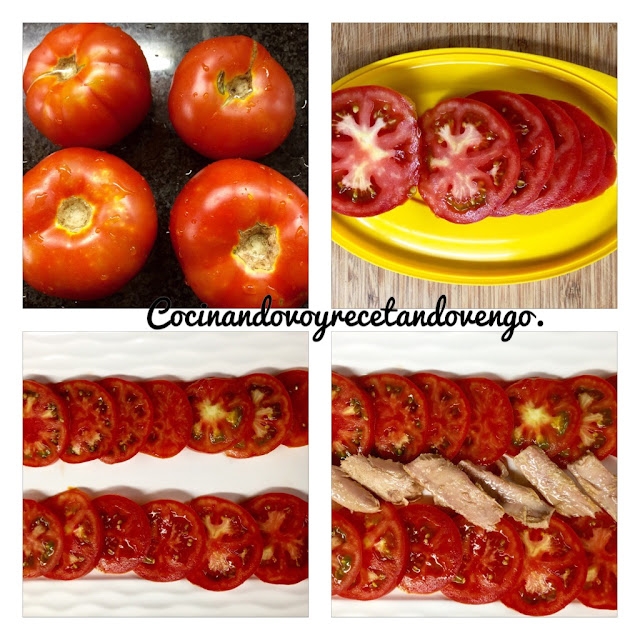 Lavamos los tomates y los cortamos como más nos guste, yo suelo servirlos en rodajas. Colocar en tomate en una ensaladera.