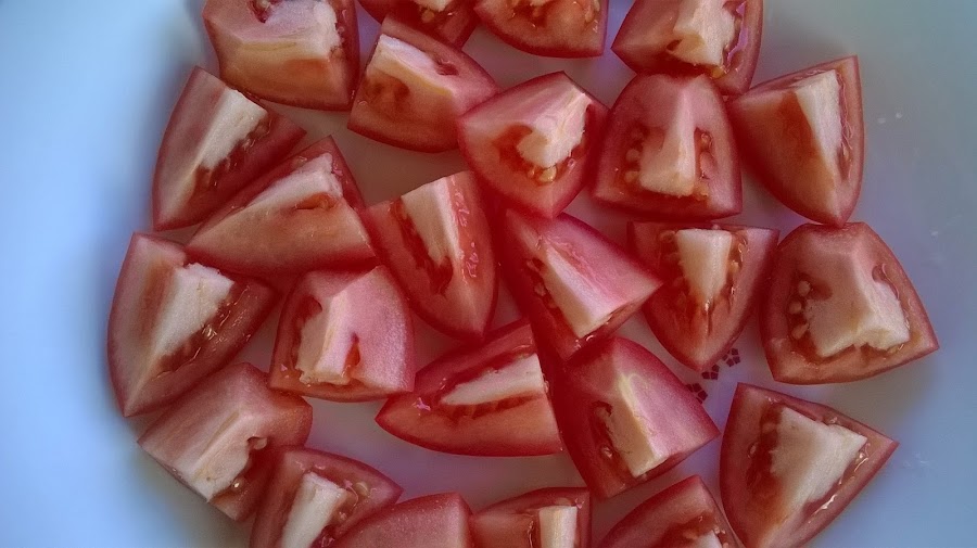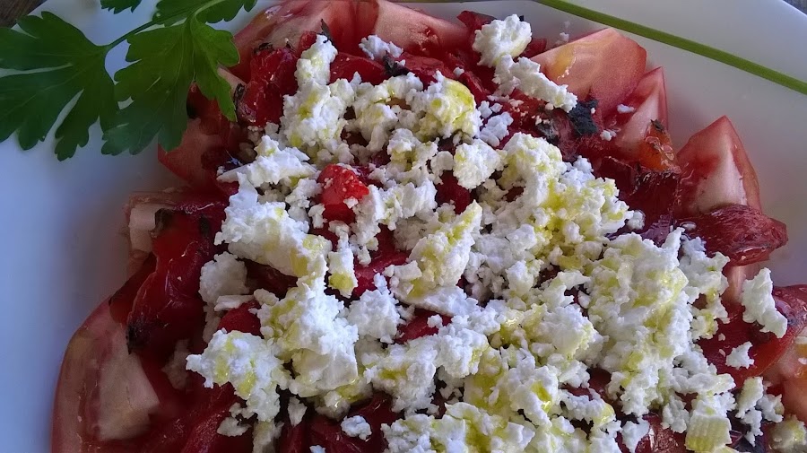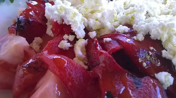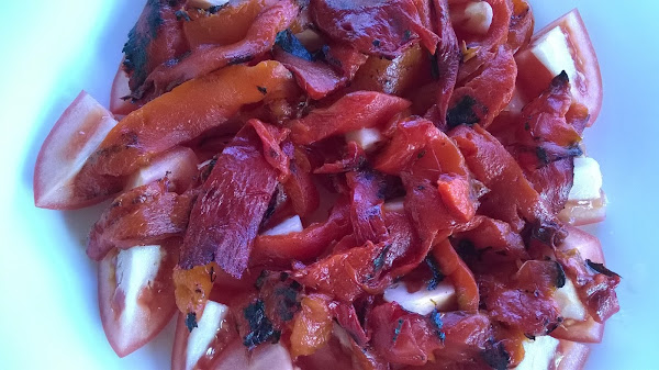 5- Cortar los pimientos en tiras, mientras están todavía calientes y poner por encima de los tomates.