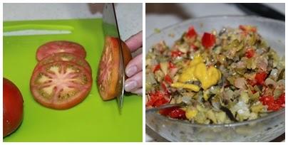 Lavamos los tomates y los cortamos en rodajas finas. Picamos con la picadora los encurtidos y el pimiento rojo. Lo aliñamos todo con sal, pimienta al gusto y la mostaza.