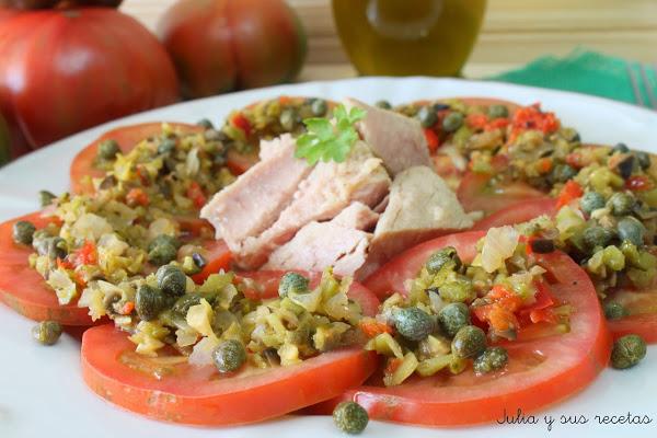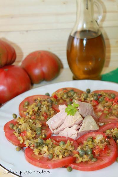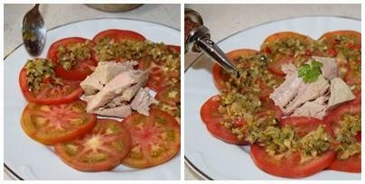 Colocamos los tomates en la fuente donde vamos a servir la ensalada. En el centro ponemos los trozos de atún, y la vinagreta la ponemos por encima de los tomates.