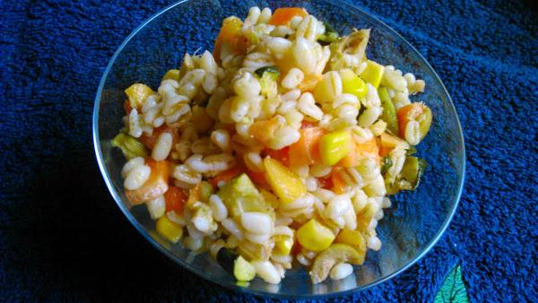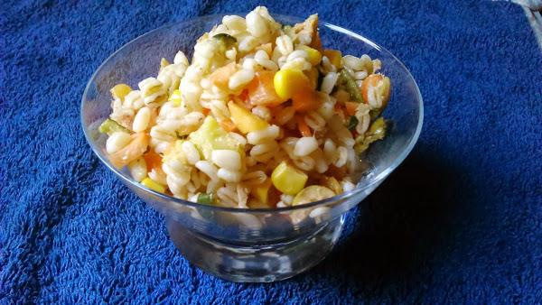 En una ensaladera amplia mezclamos el trigo, el calabacín, las zanahorias, el tomate, las aceitunas, los pepinillos, el melocotón, el maíz escurrido, el atún, la mejorana, el orégano y una pizca de sal.