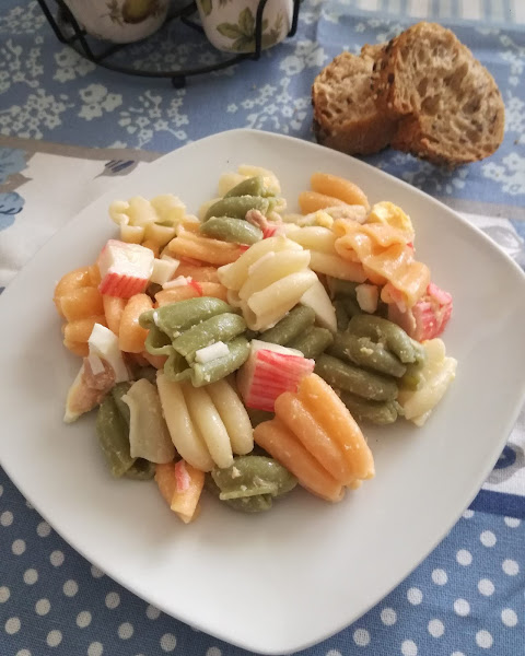 En una fuente o ensaladera vertemos la pasta, troceamos los huevos cocidos, añadimos la lata de bonito y picamos los palitos de cangrejo.