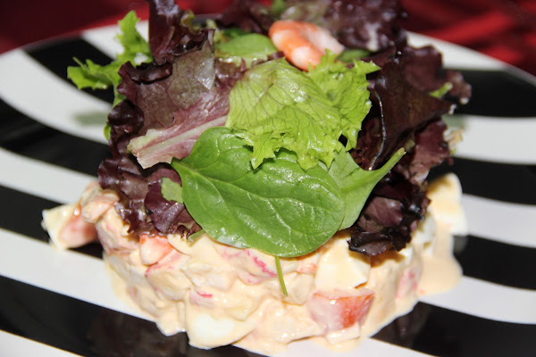 Picar los langostinos ,los huevos y los palitos de txakka en cachos no muy pequeños y mezclarlo con la mahonesa.