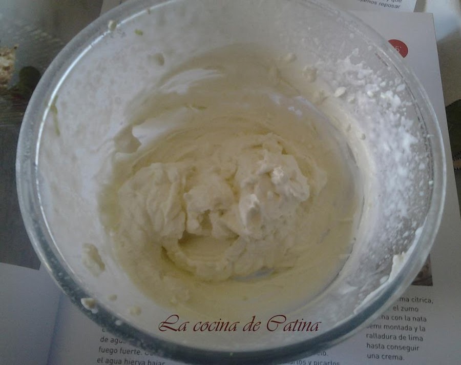 Para la crema cítrica, mezclamos el zumo de lima con la nata (crema de leche) semimontada y la ralladura de lima hasta conseguir una crema.