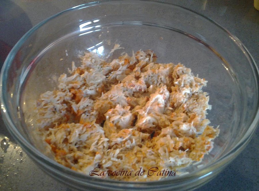 Pelar y picar los huevos finamente y mezclarlos con la carne de txangurro y la mayonesa, sazonar y mezclar bien hasta conseguir una masa homogénea.
