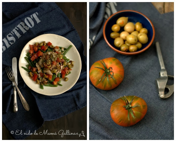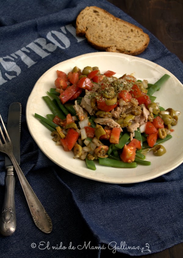 Para mí es un buen plato único, porque tiene de todo y las vainas llenan un montón. Si os gustan las aceitunas es importante que elijáis unas buenas, de sabor intenso porque le dan mucha gracia al plato. También podéis sustituir el bonito por huevo duro o por sardinillas.