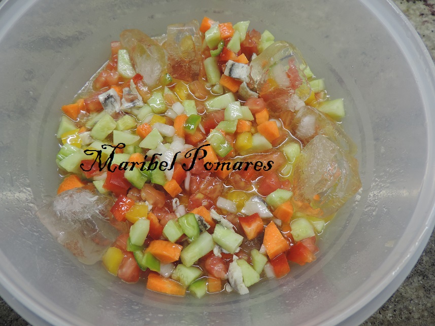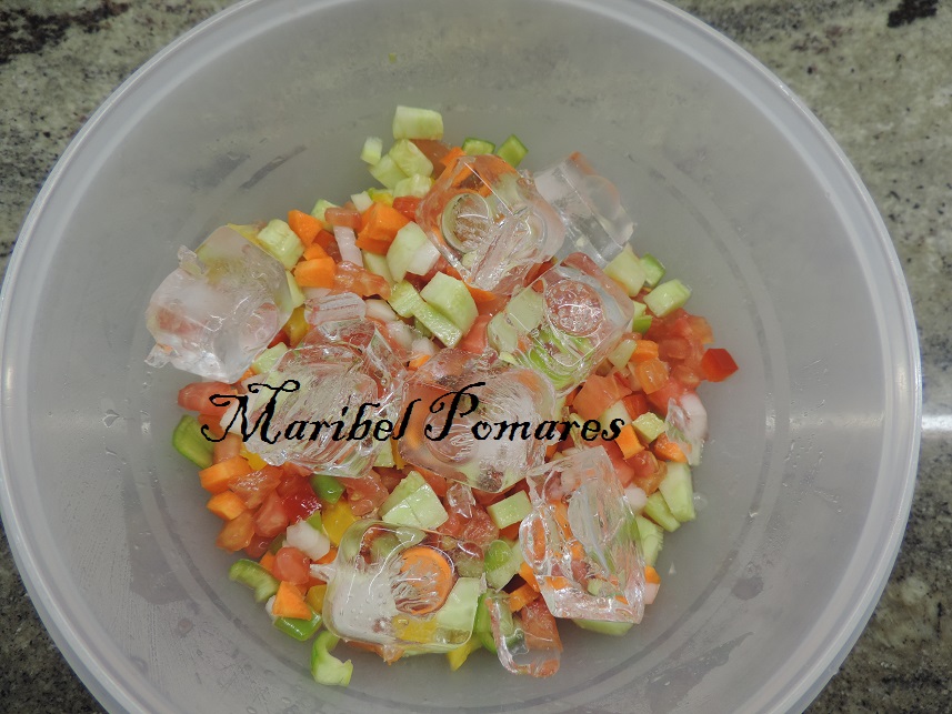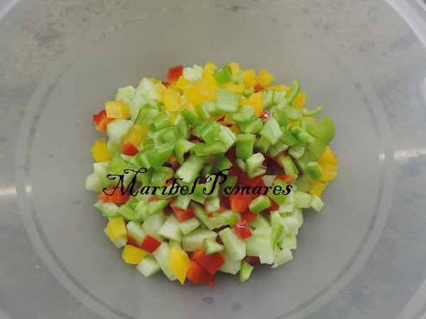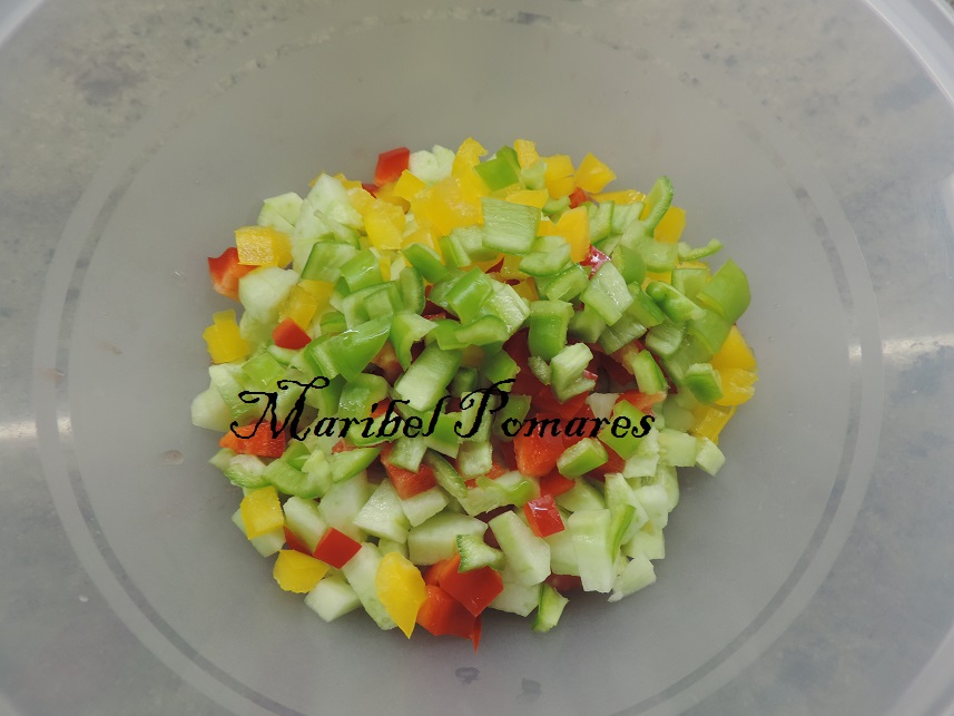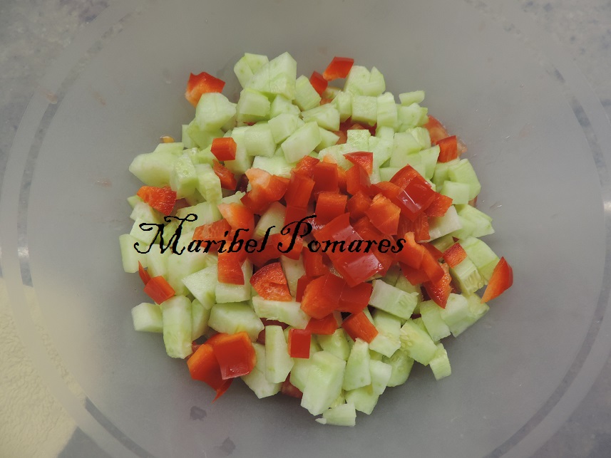 Pelamos y cortamos el pepino y lo añadimos al tomate.