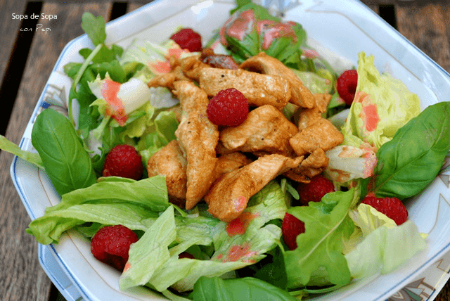 Repartir la ensalada en 4 platos de servir, repartir también el resto de las frambuesas y las tiras de pollo. Terminar de aliñar con la vinagreta reservada por encima.