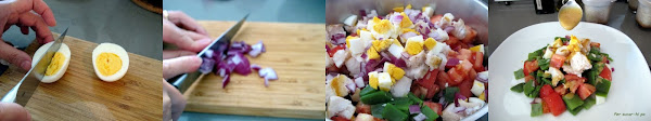 Pelar el huevo duro y cortarlo en trozos de tamaño similar a los anteriores. Picar un poco de cebolla roja.