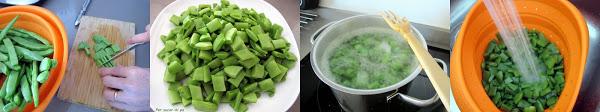 Lavar, pelar y cortar las judías verdes en cuadraditos pequeños. Colocar una cazuela al fuego con abundante agua, añadir un poco de sal y cocer las judías. El punto de cocción es muy personal, a mí me gusta que queden un poco crujientes, al "dente". Cuando estén listas retirar, escurrir y enfriar bajo el agua del grifo para parar la cocción. Reservar.