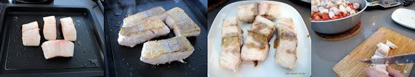 En una plancha o sartén al fuego con unas gotas de aceite, pasar los lomos de merluza. Si son finitos, como éstos, bastarán dos o tres minutos por cada lado. Sacar del fuego y retirar la piel. Cortar en trozos pequeños y reservar.
