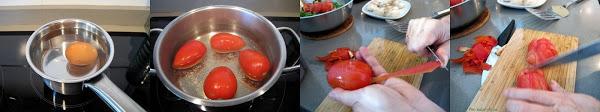 En otra cazuela poner los tomates a escaldar, suficiente sumergirlos unos 30 segundos en agua hirviendo. Retirar y cortar la cocción poniéndolos en agua muy fría. Pelarlos, con esta técnica la piel se desprende rápida y fácilmente. Cortar en trozos pequeños y reservar.