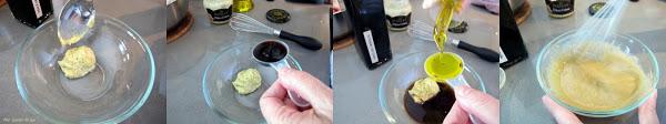 Para hacer la vinagreta poner un bol una cucharada de mostaza al gusto, una cucharada de vinagre balsámico y tres cucharadas de aceite de oliva. Sazonar y emulsionar la mezcla con la ayuda de unas varillas.