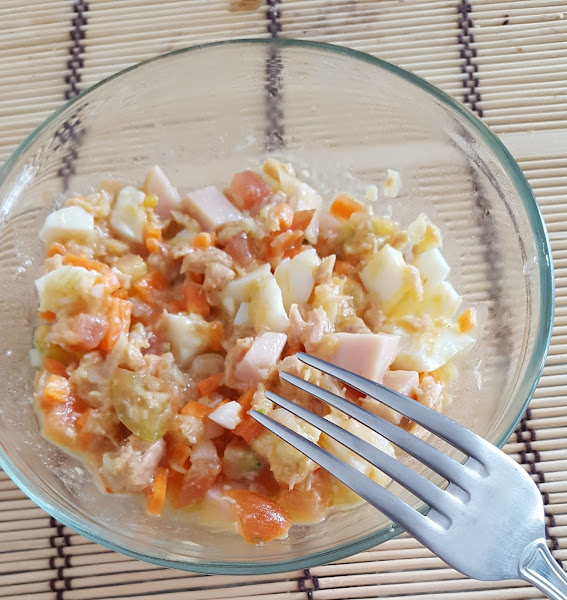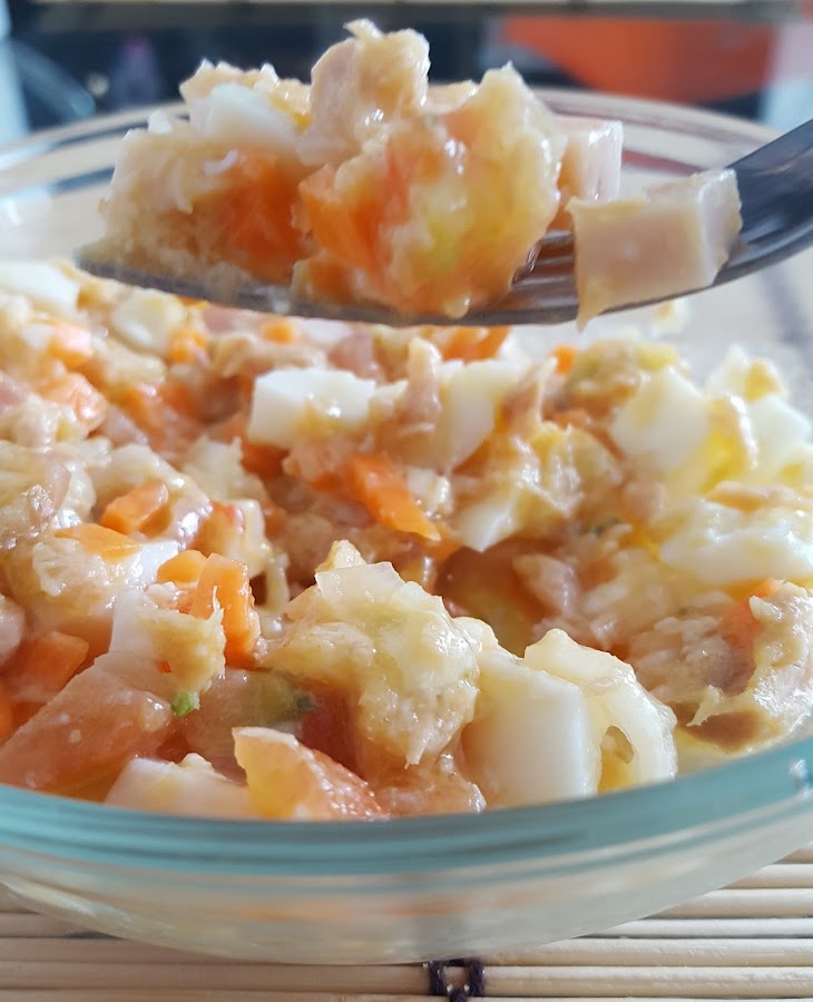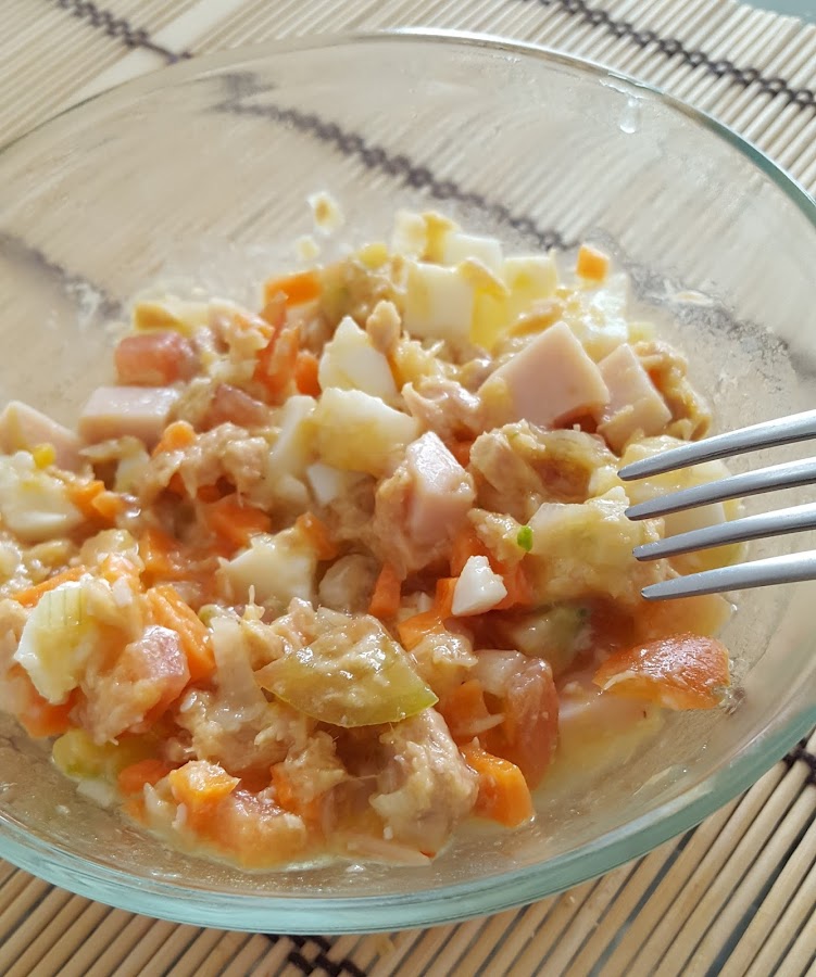 *NOTA: Las cantidades en los ingredientes se pueden variar dependiendo si nos gustan más o menos. Por ejemplo, poner 1/4 de cebolla, 2 zanahorias, no poner la pechuga,... Lo bueno de esta ensalada es que partimos de la base de atún, tomate y cebolla y podemos agregar o quitar según nos apetezca.