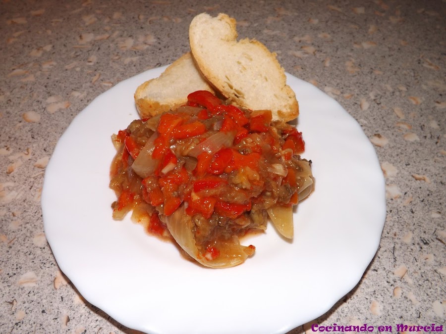2 pimientos rojos,1 berenjena,2-3 cebollas,2 ajos,aceite,salEsta ensalada se come fría, así que si os la queréis comer por la noche sería mejor hacerla por la mañana o por la tarde temprano para que dé tiempo de enfriarse y coja el sabor de todo.