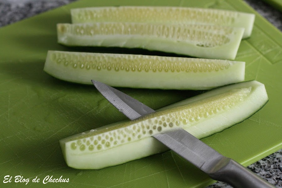 Lo primero que hacemos es lavar el pepino, cortarlo por la mitad y