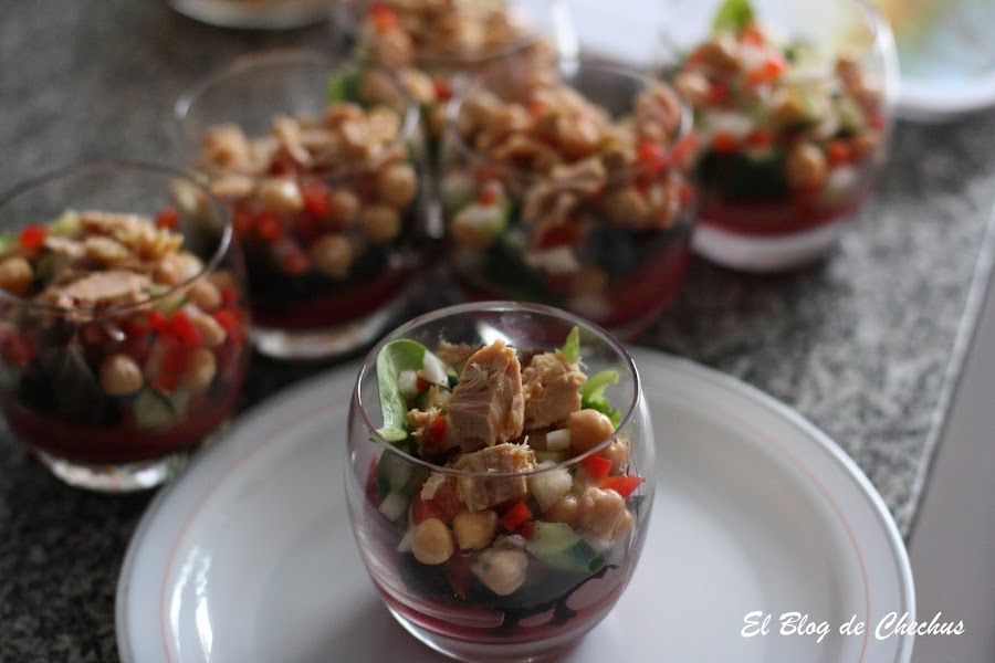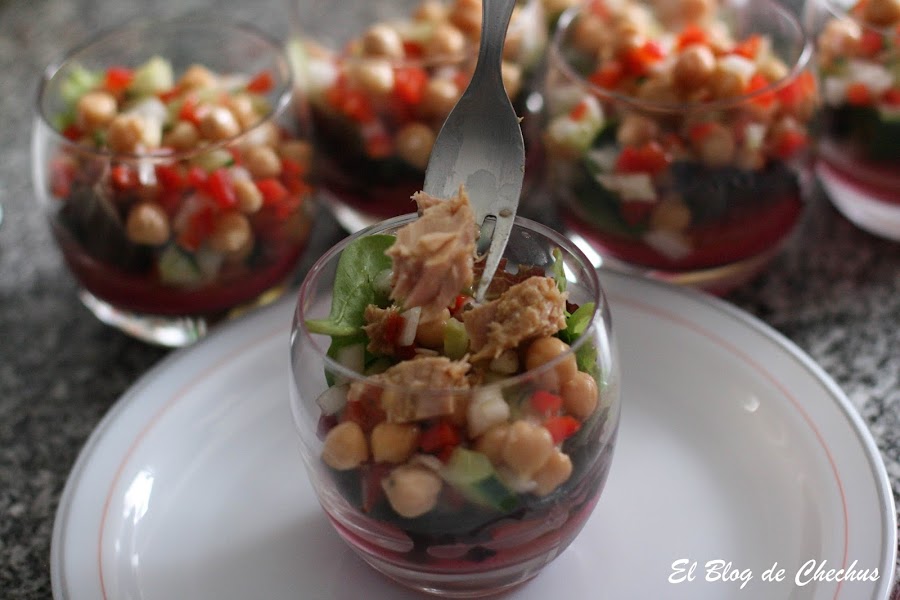 Hoy tenemos una ensalada muy completa, pues tiene verduras, legumbres y pescado. Lo mejor es que hagas el humus el da anterior, y as es mucho mas rpido. Te pongo el enlace de la receta del humus. Humus de remolacha