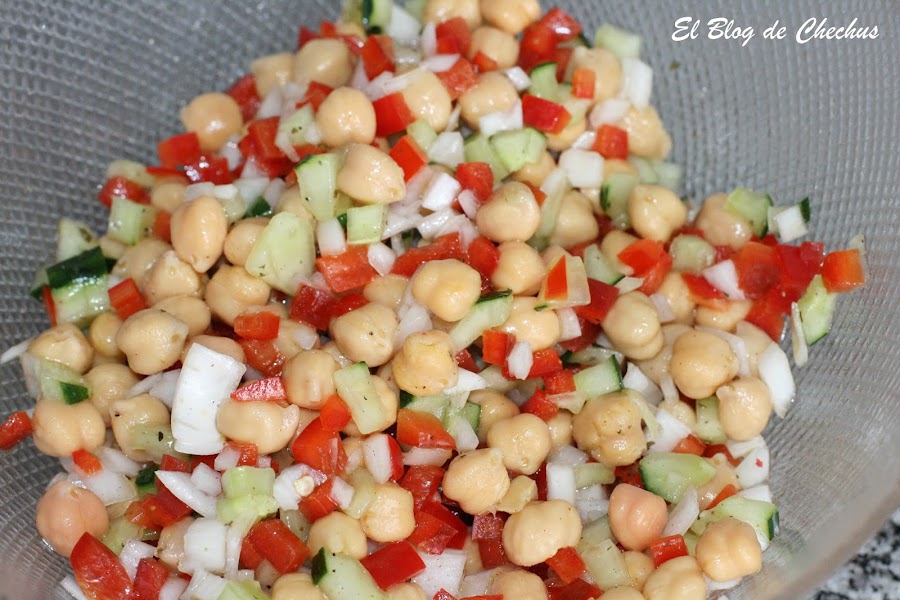 Despus lo lavamos y lo cortamos a trocitos pequeos. Reservamos en un bol. Cortamos tambin la cebolleta y el pimiento rojo a trocitos. Lo aadimos al bol del pepino. Aderezamos con sal, pimienta, zumo de limn, un poco del aceite de ssamo ( no pasa nada si no le pones..), aceite de oliva, perejil, canela y cominos. Si es verano la reservas en el frigo hasta que la montes. Sino, le aades los garbanzos y lo integras todo.