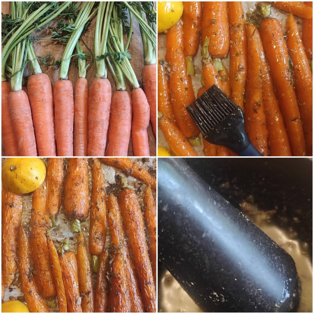 Cuando tengas las zanahorias listas, ponlas en una bandeja de hornear y báñalas con la marinada, ayúdate con un pincel. Agrega las mitades de la naranja y el limón con el corte mirando hacia abajo. Mete en el horno unos 25-30 minutos.