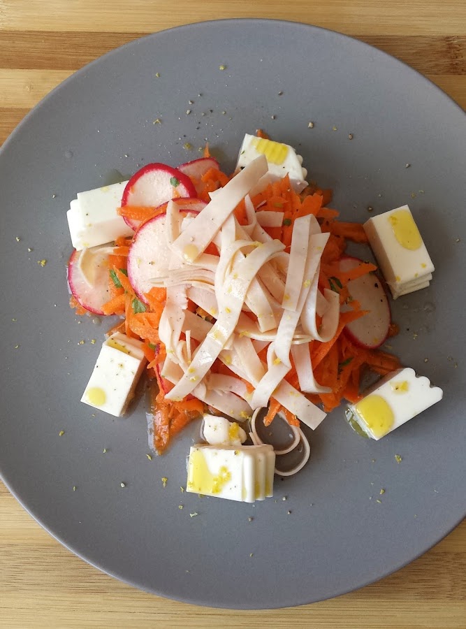 Para montar nuestra Ensalada solo tendremos que poner un montoncito de la Zanahoria con el Rabanito aliñada en el centro de un plato de presentación, ponemos unos dados del Queso Fresco y las tiras de Pavo sobre la Zanahoria. Unas gotas de aceite de oliva y espolvoreamos con pimienta negra molida y si lo deseamos unas escamas de sal sobre el Queso Fresco.
