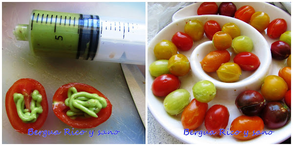 6. Ahora tenemos que rellenar los tomatitos cherry. Yo primero inyecté el guacamole con una jeringuilla de cocina, pero al ser tan pequeños, no había espacio apenas para el guacamole. Así que me decidí por abrir los tomatitos por la mitad, vaciarlos y rellenarlos con el guacamole, para eso con una cucharilla sobra. El guacamole es cremoso y pega las 2 partes del tomate cuando las volvemos a unir. Y por supuesto no se desperdicia nada, el contenido de los tomates lo reciclamos en una tostada u otra receta.