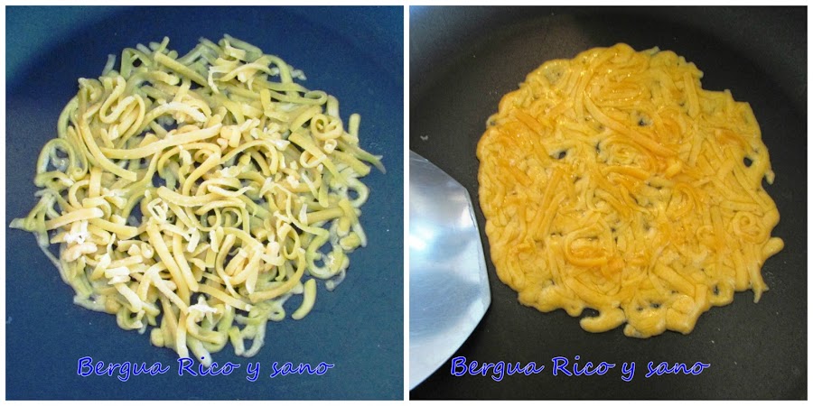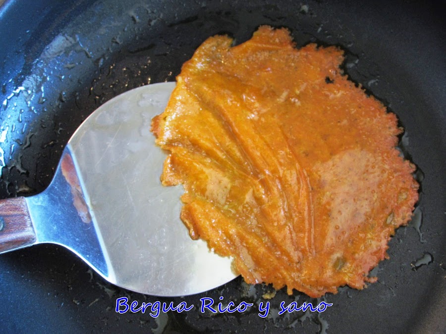 2. Hay que levantar una esquinita con una espátula para ver si podemos darle la vuelta; si el queso se pega a la espátula, es demasiado pronto. Si no se pega, levantamos con cuidado el círculo con la espátula y le damos la vuelta. No hay que dejar que se cocine de más o quedará muy duro y no podremos darle forma. Le damos un par de minutos por el otro lado, de nuevo hasta que se pueda levantar con la espátula sin que se pegue.