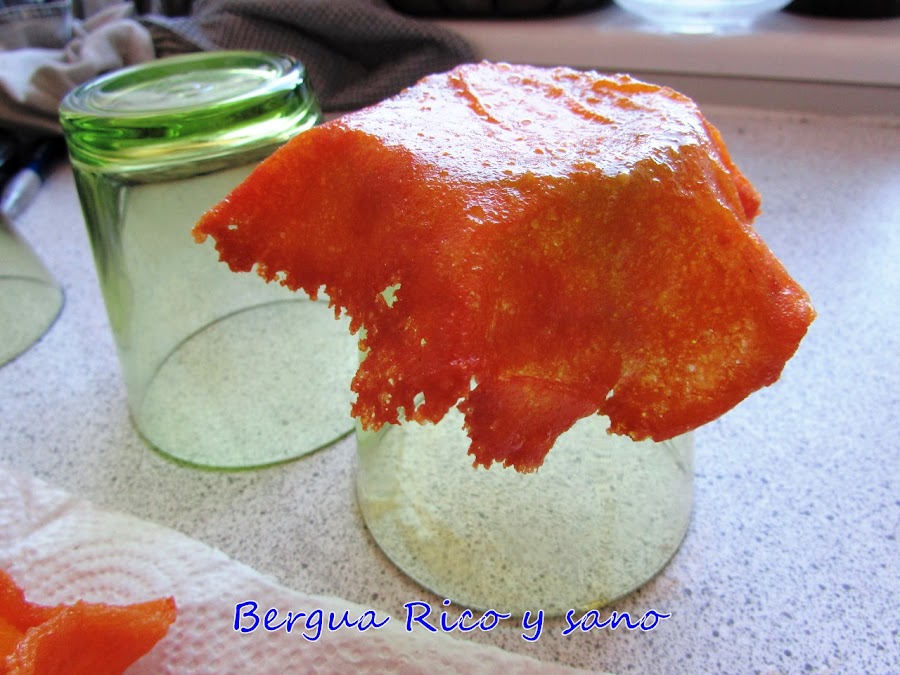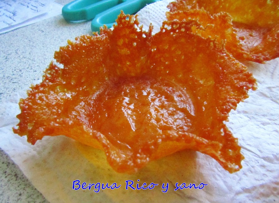3. Tendremos preparado papel absorbente sobre una superficie y vasos boca abajo sobre el papel absorbente. Deslizamos nuestro círculo de queso con delicadeza sobre el culo del vaso, de forma que quede centrado. Los lados se irán plegando por su propio peso, pero podemos ayudarnos de la espátula para exagerar la forma o doblar más algunas paredes.
